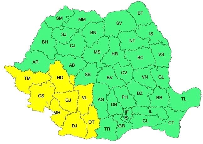 În Banat, Oltenia și sud-vestul Transilvaniei vor fi perioade cu instabilitate atmosferică. Aceasta se va manifesta prin averse torențiale, intensificări ale vântului (rafale în general de 50...70 km/h), vijelii, grindină și descărcări electrice. În intervale scurte de timp sau prin acumulare cantitățile de apă vor fi de 20...30 l/mp și izolat de peste 40 l/mp.