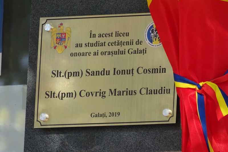 Punctul central al ceremonialului l-a constituit dezvelirea, la Liceul Tehnologic „Anghel Saligny”, a unei plăci comemorative, situată la intrarea în şcoală. Au fost dezvelite și două plăcuțe care vor da numele bibliotecii și amfiteatrului liceului: sublocotenent post-mortem Ionuț Cosmin Sandu și sublocotenent post-mortem Claudiu Marius Covrig. Ambii au fost absolvenți ai acestei instituții de învățământ. Președintele sucursalei Galați, domnul Adrian Baccela, a declarat: „