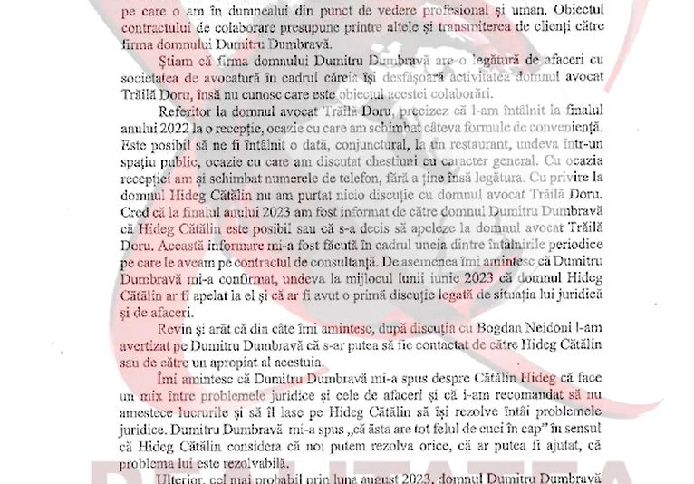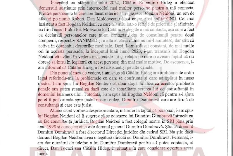 Cătălin Hideg: "Dl.Coldea spune că eu m-am dus la Dumitru Dumbravă înainte de a mă întâlni cu dânsul. Deci prima dată m-am întâlnit cu Florian Coldea la un restaurant, după care dânsul i-a dat OK-ul lui Neidoni, Neidoni l-a sunat pe Tocaci, care a vorbit cu Dumbravă care a stabilit prima întâlnire (cu Hideg - n.r.)".