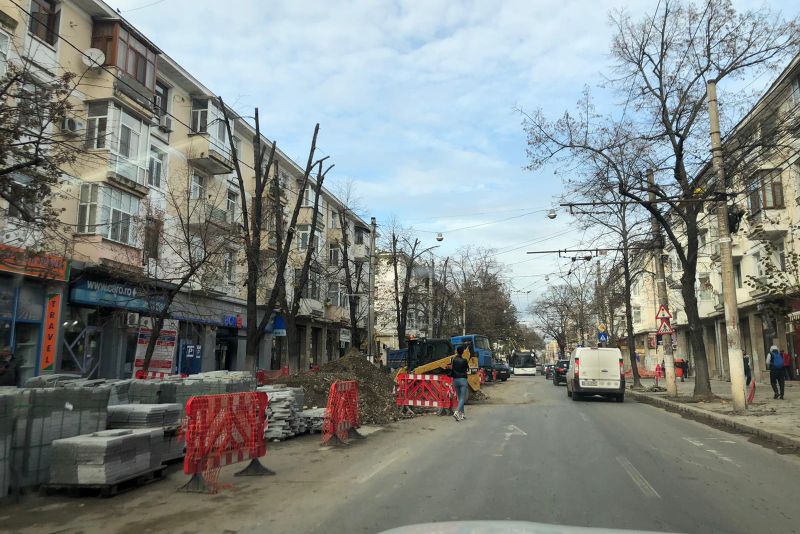 În Centru, pietonii circulă alături de excavatoare printre gropi