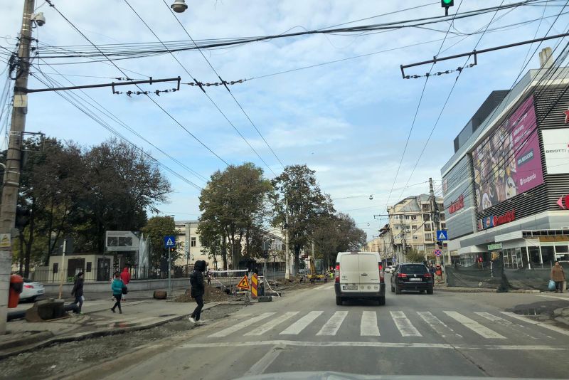 Șantierul de pe strada Domnească, din zona magazinului Winmarkt este în plină desfășurare. Trotuarele sunt decupate, înconjurate de o pânză ce delimitează șantierul și zonele periculoase. Pietonii în schimb sunt nevoiți să improvizeze pentru a traversa. În fața fostelor chioșcuri de la Modern spațiul alocat celor ce așteaptă la semafor este practic inexistent, iar pe partea cu parcul Eminescu povestea se repetă - deși lucrările la parc sunt terminate, se adaugă de data asta excavatoarele galbene care execută lucrările.De-a lungul începutului bulevardului până la intersecția unde se află hotelul Centrum țevile, muncitorii și gardurile de protecție se regăsesc pe același trotuar. Astfel se face că pietonii circulă alături excavatoare printre gropi. Ba chiar unii, încercând să evite, merg pe carosabil pe lângă mașini.