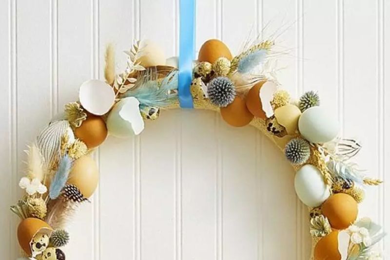 După ce ați terminat coronița, e timpul să vedeți cum vreți să o decorați. Se lipesc apoi cojile de ouă, mai mari sau mai mici, pe care le puteți colora cu tempera sau cu vopsea de ouă. Pe lângă coji de ouă puteți folosi orice vă inspiră: staniol, hârtie creponată, fragmente din globurile care poate s-au mai spart la Crăciun, năsturași, podoabe pe care le mai aveți în casă, absolut orice, totul este să fie cât mai ușor, să cântărească foarte puțin. Și aici vă puteți lăsa imaginația în voie. Important este să fie lipite toate cât mai aproape unele de altele, pentru ca toată suprafața coroanei să fie acoperită. Lăsați puțin loc unde veți lega panglica de care o veți agăța pe ușă, la geam sau chiar pe perete.