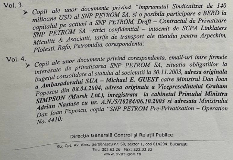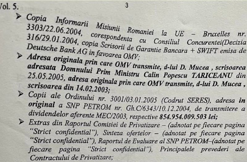 Volumul 5: Corespondenta la Consiliul COncurenței, adresa originala catre dl Mucea, adresata premierului C.P.Tariceanu, copie ordin de transmitere dividende, respectiv 854.954.009.503 lei, adresa originală catre Michael Guest, orginal scrisoare intenție Aqua Group, adresa Petrom privind notificari ale OMV.