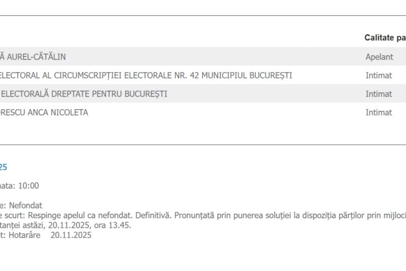 ”Respinge apelul ca nefondat. Definitivă. Pronunţată prin punerea soluţiei la dispoziţia părţilor prin mijlocirea grefei instanţei astăzi, 20.11.2025”, se arată în hotărârea Curții de Apel București postată pe portalul instanțelor de judecată.