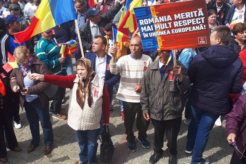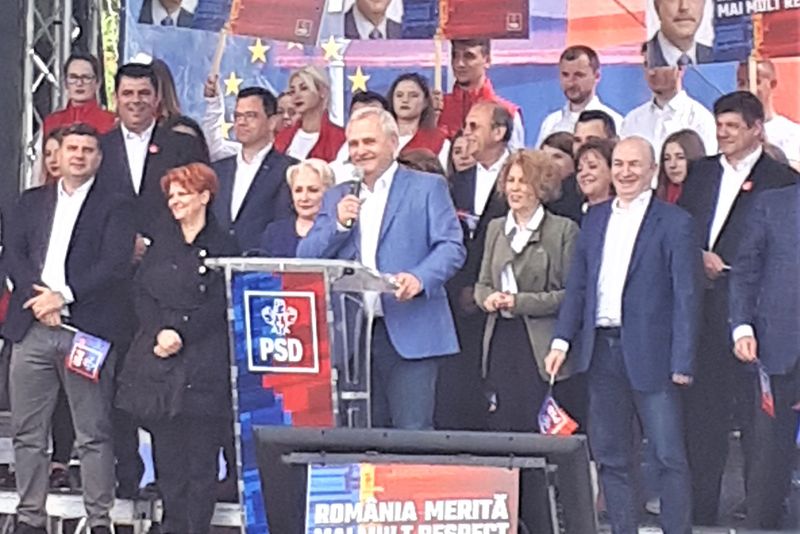 Nu lipseau bannerele produse industrial, inclusiv pancartele aparţinând diferitelor comune erau la fel, produse, în mod evident, centralizat. Oamenii ţineau în mâini inclusiv aceleaşi sticle de apă, furnizate de organizatori.Steaguri fluturau, fiind însă strânse, la semnul animatorului Florin Pâslaru, ca să se poată filma venirea oaspeţilor: premierul Viorica Dăncilă, preşedintele PSD, Liviu Dragnea, europarlamentarii PSD Dan Nica (Galaţi) şi Rovana Plumb, Carmen Avram, Lia Olguţa Vasilescu şi alţii.