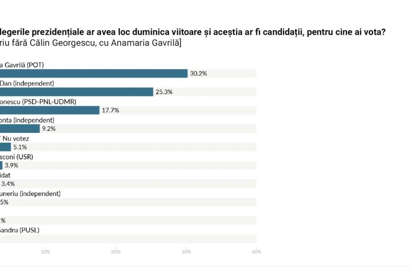În scenariul în care Anamaria Gavrilă ar fi candidata unică a suveraniștilor, aceasta ar obține 30.2% din voturi, urmată de Nicușor Dan, cu 25.3%, Crin Antonescu – 17.7%, Victor Ponta – 9.2%, Elena Lasconi – 3.9%, în timp ce un alt candidat ar obține 3.4%. Independentul Daniel Funeriu apare și el în măsurătoare, fiind creditat cu 2.5%.
