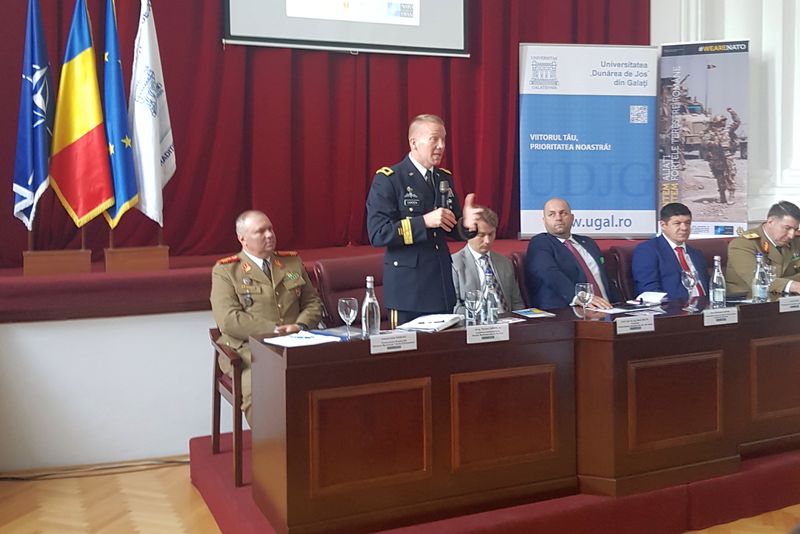 General de brigadă Iulian Berdilă, şeful Direcţiei Planificare Strategică din Statul Major General, şi general de brigadă Thomas Carden jr., locţiitorul comandantului Diviziei Multinaţionale de Sud-Est, au discutat cu tinerii din Galaţi despre infrastructura militară deficitară a României, alocarea a 2% din PIB pentru Apărare, precum şi despre utilitatea înfiinţării unei baze NATO la Galaţi.